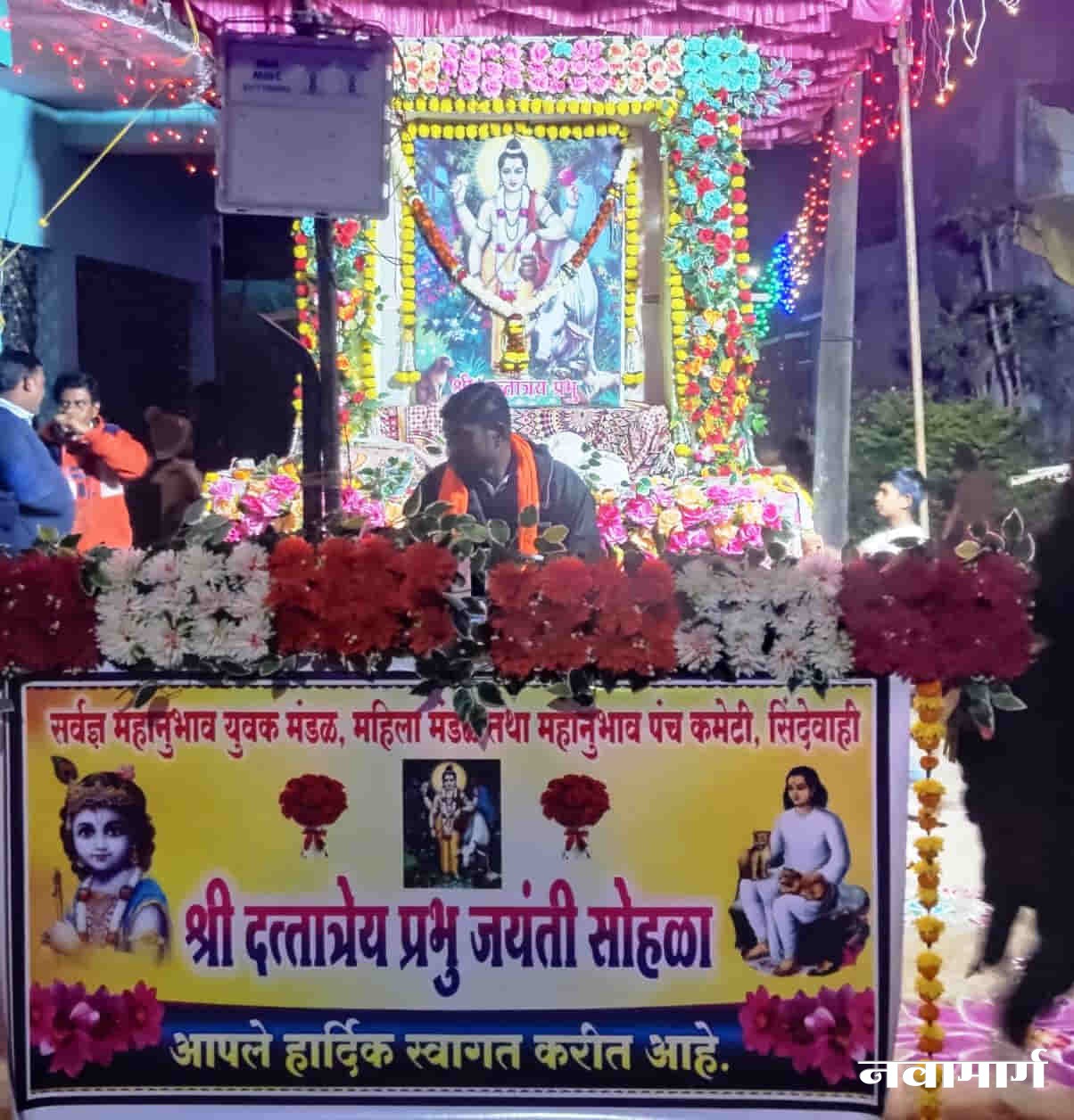 सिंदेवाही : शहरातील नविन दत्त मंदिर येथे दि.१३ ते १५ डिसेंबर दरम्यान श्री दत्त जयंतीनिमित्त विधिवत पूजन, अभिषकांने, आणि विविध धार्मिक कार्यक्रमाने भक्तिमय वातावरणात श्री दत्त जयंती साजरी करण्यात आली.