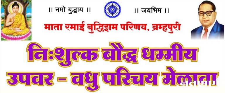 ब्रम्हपुरी : माता रमाई बुध्दीझम परियणय ब्रम्हपुरी यांच्या विद्यमाने आज रविवार दि. २९ डिसेंबर ला सकाळी १० वाजता राणी दुर्गावती कन्या विद्यालय तथा कनिष्ठ महाविद्यालय, तुळजाबाई प्राथमिक शाळेच्या मागे, आरमोरी रोड, गडचिरोली, येथे निःशुल्क उपवर – वधु परिचय व पालक मेळाव्याचे आयोजन करण्यात आलेले आहे.