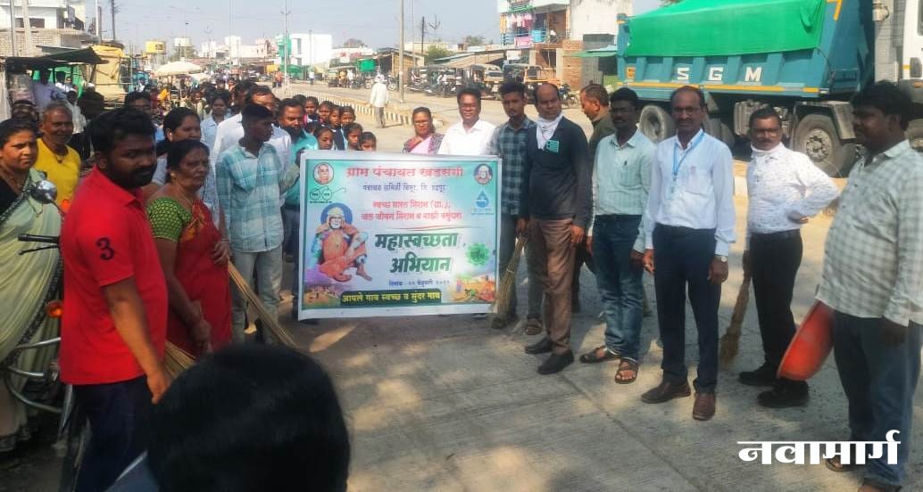 चिमूर : स्वच्छ भारत मिशन, जल जिवन मिशन व माझी वसुंधरा अंतर्गत महास्वछता अभियान कार्यक्रम खडसंगी ग्रामपंचायत माध्यमातुन आपले गाव स्वच्छ व सुंदर गाव राबविण्यात आला. या कार्यक्रमामध्ये चिमूर पंचायत समितीचे संवर्ग विकास अधिकारी नितीन फुलझेले यांनी चक्क हातात झाडू घेउन सहकार्याच्या माध्यमातून खडसंगी परिसर व चिमूर – वरोरा राष्ट्रीय महामार्ग तसेच प्राथमिक आरोग्य केंद्रातील परिसर स्वच्छ केले.
