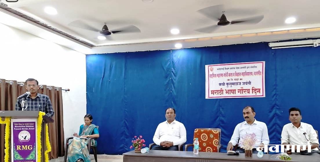 . कार्यक्रमाचे अध्यक्ष प्राचार्य डॉ जी. डी. देशमुख यानी ‘आपल्या मराठी भाषेला जितका मोठा समृदध वारस्याचे वैभव आहे तितकीच मोठी आणि थोर साहित्य परपरा आहे तिचे जतन केले पाहिजे. असे सांगितले.कार्यक्रमाचे सूत्र सचालन प्रा. कुसुम चौधरी यानी केले तर आभार प्रा. प्रमोद डबले यानी मानले कार्यक्रमाला महाविद्यालयातील प्राध्यापक डॉ. राजेंद्र चव्हाण, प्रा. निलेश गोडे, डॉ.अतुल नागपुरे,डॉ.मनीष मते, प्रा.चक्रधर भुर्रे, डॉ.अंकुश कायरकर, प्रा.प्रेमकुमार, खोब्रागडे, प्रा.श्रीकात वनमाळी प्रा.किशोर बोरकर, प्रा.नीरा सिंग तसेच शिक्षकेतर कर्मचारी व महाविद्यालयातील विद्यार्थी याची मोठ्या संख्येने उपस्थिती होती.
