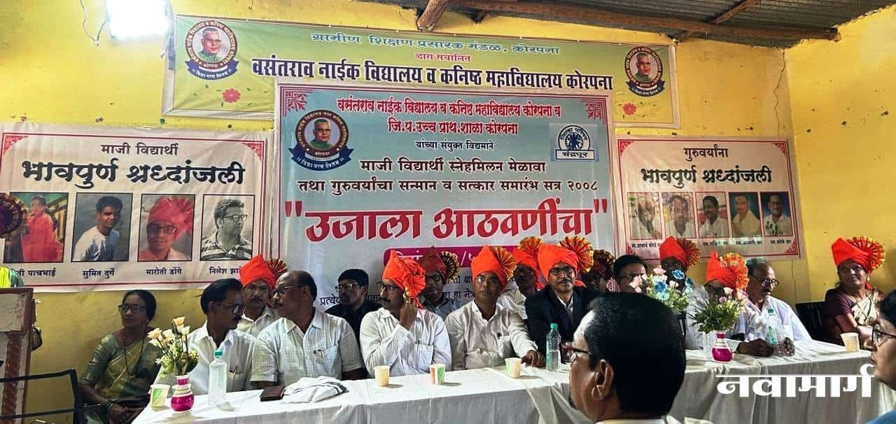 कोरपना : जिल्हा परिषद उच्च प्राथमिक शाळा व वसंतराव नाईक विद्यालय तथा कनिष्ठ महाविद्यालय कोरपनाच्या माजी विद्यार्थी व शिक्षकांनी स्नेहमिलन सोहळ्यात जुन्या आठवणीना उजाळा देत गुरुवर्यांचा सन्मान समारंभ वसंतराव नाईक विद्यालय कोरपना येथे पार पडला.