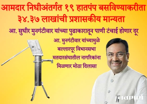 . बल्लारपूर मतदारसंघातील २१ ठिकाणी हातपंप आणि सोलार पंप बसविण्याच्या कामांसाठी ७१.६२ लाख रुपयांची प्रशासकीय मान्यता यापूर्वीच मिळालेली होती आणि आता ३४.३७ लाख रुपयांची प्रशासकीय मान्यता मिळाल्याने मुल, बल्लारपूर, पोंभुर्णा आणि चंद्रपूर तालुक्यातील अनेक गावांमधील नागरिकांना शुद्ध पिण्याचे पाणी उपलब्ध होणार आहे.