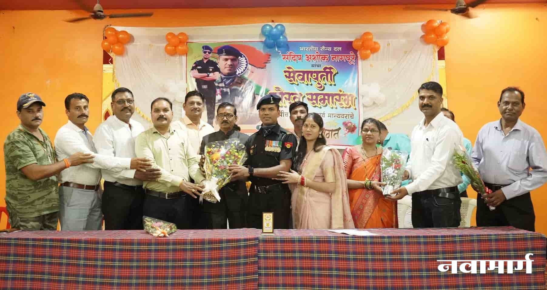 .     स्थानिक मित्रपरिवार, जयहिंद फाउंडेशन आणि त्यांचे चाहत्यांनी बाजारात तिरंगा यात्रा काढून त्यांचे स्वागत केले. त्यानंतर देशभक्तीपर गीतांच्या ढोल ताशांच्या गजरात भद्रावती शहराच्या मुख्य मार्गाने भव्य मिरवणूक काढण्यात आली. भोज वार्डातील अशोकराव नागपुरे यांचा मुलगा संदिप नागपुरे यांनी त्यांच्या १६ वर्षाच्या सेवाकाळात चंदीगड मधील चांदिमंदिर कॅट, बारा मुल्ला जम्मू कश्मीर येथील राष्ट्रीय रायफल बटालियन, जोधपुर मधील 12 कोर सिग्नल रेजिमेंट, सतवारी जम्मू येथे २६ इन्फंट्री डिव्हिजन सिग्नल रेजिमेंट आणि शेवटी दिल्ली येथील आर्मी हेडक्वार्टर येथे सेवा देऊन देशाचे रक्षण केले. भद्रावती शहरातील नागरिकांनी व चाहत्यांनी फुलांचा वर्षाव करून त्यांचे सपत्नीक भव्य स्वागत केले. डीजेच्या तालावर शहरात मिरवणूक काढण्यात आली. त्यानंतर स्थानिक श्री बालाजी सभागृहात सेवापुर्ती अभिष्टचिंतन सोहळा घेण्यात आला.