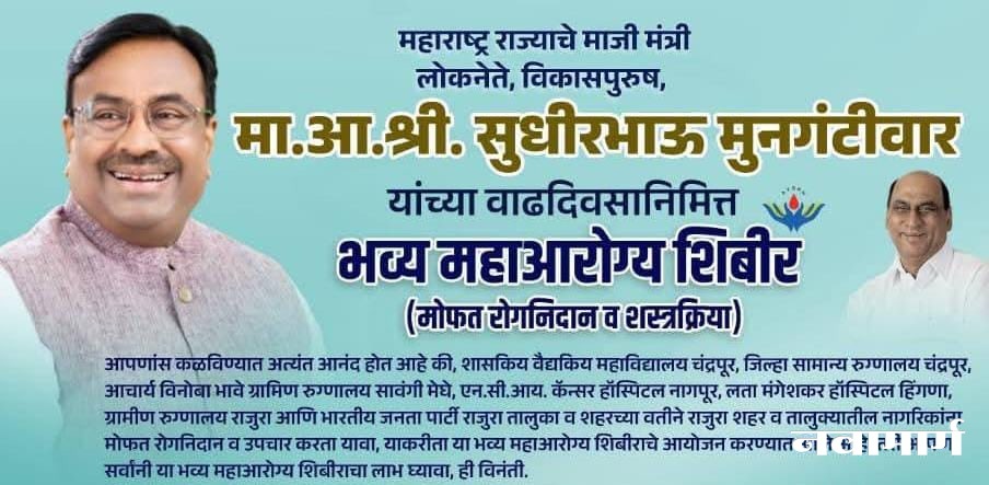 🔸 आ. सुधीर मुनगंटीवार यांच्या वाढदिवसानिमित्त महाआरोग्य शिबीराचे आयोजन