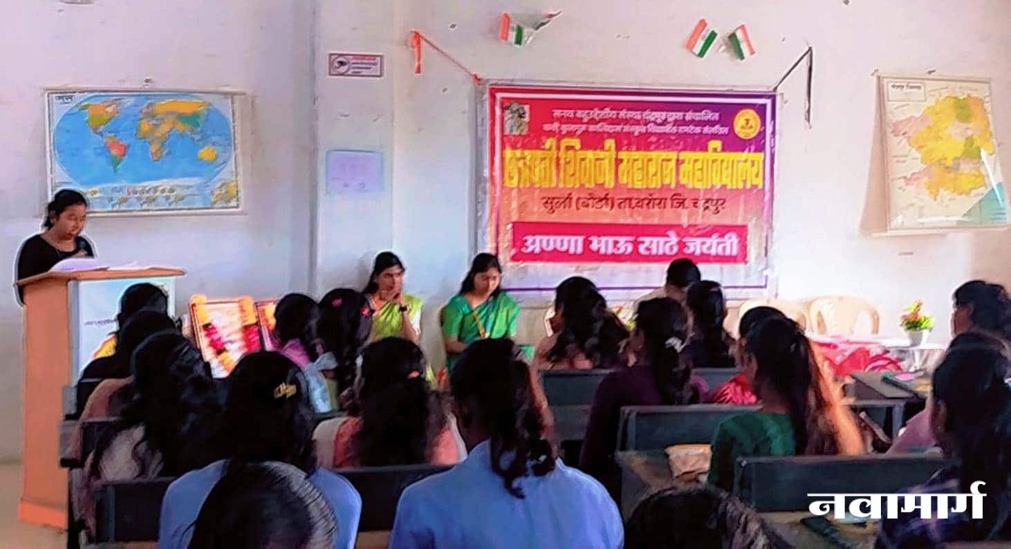 . या प्रसंगी कार्यक्रमाचे अध्यक्ष सनय बहूउद्देशीय संस्था चंद्रपूर चे अध्यक्ष सुधाकर खरवडे यांनी लोकशाहीर अण्णाभाऊ साठे यांच्या जीवनावर मोलाचे मार्गदर्शन केले. तसेच या कार्यक्रमा प्रसंगी महाविद्यालयाचे प्राचार्य प्रा. दिनकर गुरनूले, प्रा. दिपक खामनकर, प्रा. मनोज खांडारकर, प्रा. भारती पाटील, प्रा. निकिता कापसे व अनेक शिक्षकांची उपस्थित होती.