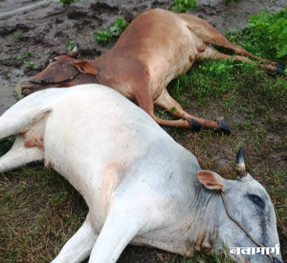 . बल्लारपूर तालुक्यातील शेतकरी सुनील खोके नेहमी प्रमाणे शेतशिवारात काम करत होते. दरम्यान दुपारी २ वाजताच्या सुमारास आकाशात काळेकुट्ट ढग जमा झाले. काही कळायच्या अगोदर मेघ गर्जनेसह पाऊस सुरु झाला. नेमक्या त्याचवेळी शेतशिवारात असलेल्या बैलजोडीवर विज कोसळली. या घटनेत दोन बैल जागीच ठार झाले. ऐन शेतीच्या हंगामात बैलजोडी ठार झाल्याने शेतकऱ्यावर मोठे आर्थिक संकट ओढावले आहे. शासनाने पिडीत शेतकऱ्याला नुकसान भरपाई देण्याची मागणी परिसरातील शेतकऱ्यांनी केली आहे.