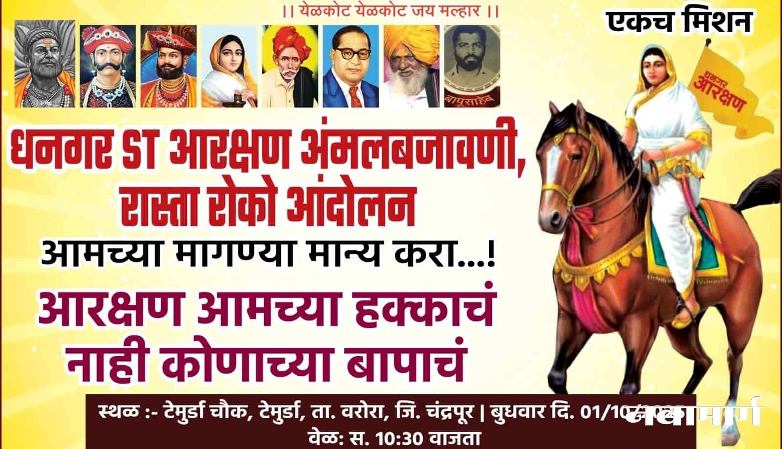 वरोरा : तालुक्यातील टेमुर्डा येथे धनगर आरक्षण अंबलबजावणी संदर्भात आज दिनांक 1ऑक्टोबर 2025 रोज बुधवार ला सकाळी 10.30 वाजता रास्ता रोको आंदोलन आहे. धनगर समाजाची आरक्षण ची अंबलबजावणी करून धनगर समाजाला एसटी प्रवर्गा मध्ये समाविष्ट करणे, शेळ्या मेंढयाना चराईसाठी वनविभाग आरक्षित जागा देणे, अहिल्यादेवी होळकर महामेष योजना चालु करणे, यशवंतराव घरकुल योजनेचा लाभ मिळावा, अश्या विविध मागण्यासाठी रास्ता रोको आंदोलन आहे.