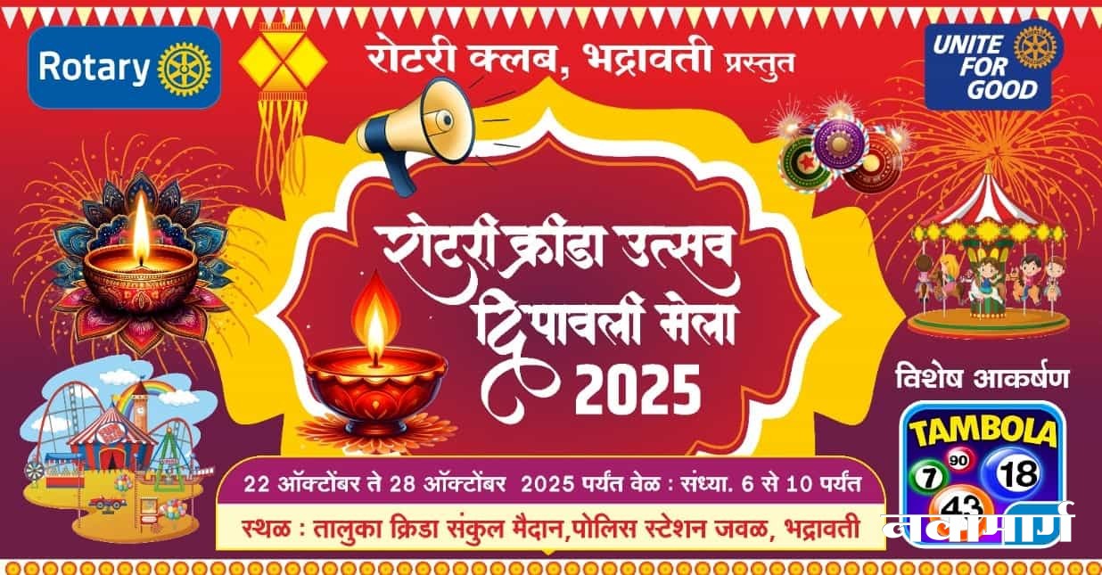 भद्रावती : “सेवा परमो धर्मः” या तत्त्वावर कार्यरत असलेला रोटरी इंटरनॅशनल हा केवळ सेवाभावी संस्था नसून जागतिक सामाजिक परिवर्तनाची चळवळ आहे. समाजातील सर्व घटकांना एकत्र आणत आरोग्य, संस्कृती आणि समाजसेवेचा संगम साधण्यासाठी रोटरी क्लब भद्रावतीने यावर्षी ‘रोटरी क्रीडा महोत्सव’ आणि ‘रोटरी दिवाळी उत्सव मेला’ या दोन प्रेरणादायी उपक्रमांचे आयोजन केले असून हे दोन्ही उपक्रम २२ ते २८ ऑक्टोबरदरम्यान तालुका क्रीडा संकुल, भद्रावती येथे होणार आहेत.