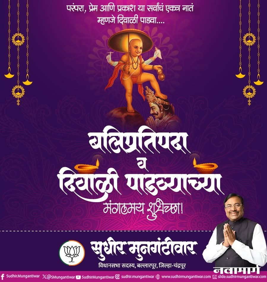 सामाजिकबलिप्रतिपदा व दिवाळी पाडव्याच्या मंगलमय शुभेच्छा !By Nava Marg - October 22, 2025557ShareWhatsAppFacebookTelegramX शुभेच्छुक : सुधीर मुनगंटीवार, विधानसभा सदस्य, बल्लारपुर, जि. चंद्रपुरशुभेच्छुक : सुधीर मुनगंटीवार, विधानसभा सदस्य, बल्लारपुर, जि. चंद्रपुर
