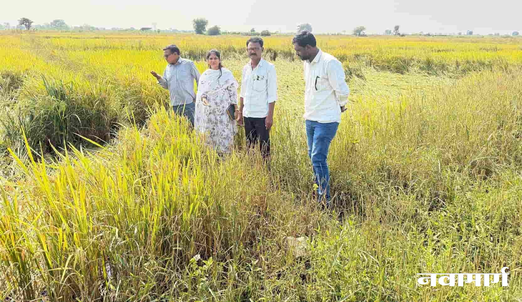 बल्लारपूर : तालुक्यात कृषी क्षेत्र कोरडवाहू आहे. शेतकऱ्यांचे उत्पादन निसर्गाच्या जलचक्रावर अवलंबून आहे. यावर्षी निसर्गाने शेतकऱ्यांची दैनावस्था केली. तब्बल १२९ टक्के पर्जन्यमान झाले. परिणामी खरीप हंगामात शेतकऱ्यांचा तोंडचा घास हिरावला आहे. पिडीत शेतकऱ्यांना दिलासा देण्यासाठी बल्लारपूर येथील तहसिलदार रेणुका कोकाटे यांनी मंगळवार (दि. ४) नोव्हेंबर रोजी बल्लारपूर तालुक्यात कोर्टीमक्ता येथील एका शेतात भात पिकांची बांधावर जाऊन प्रत्यक्ष पाहणी केली. यावेळी शेतकऱ्यांनी ओला दुष्काळ जाहीर करण्याची मागणी केली.