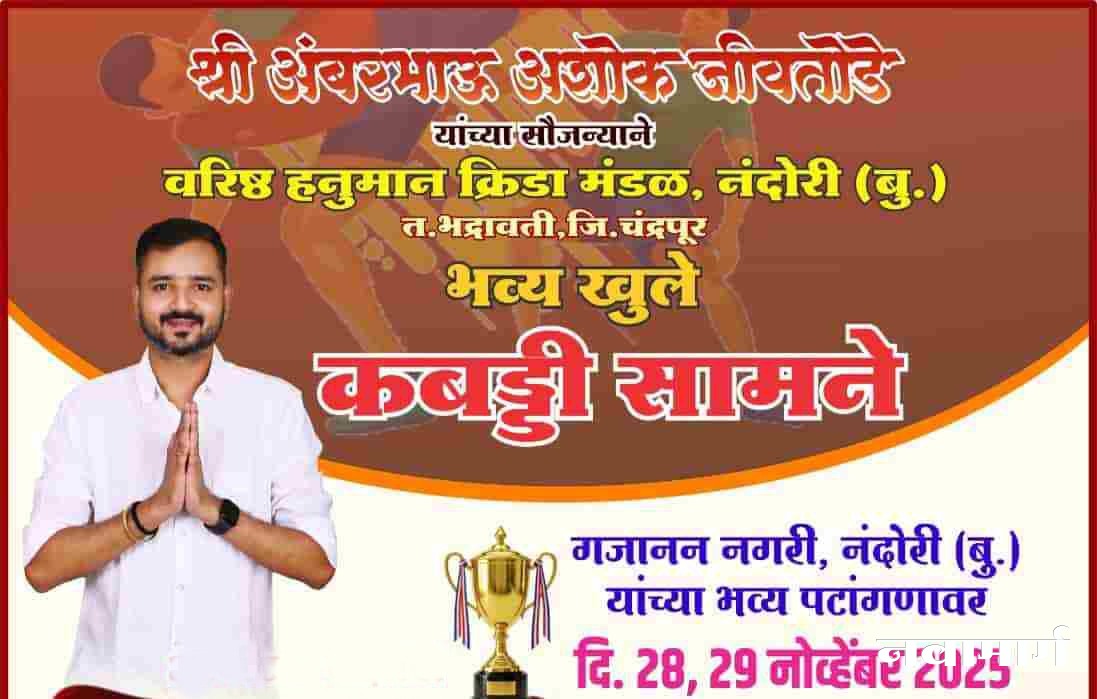चंद्रपुर : भद्रावती तालुक्यातील नंदोरी येथे सामाजिक कार्यकर्ते अंबर अशोक जिवतोडे यांच्या सौजन्याने वरिष्ठ हनुमान क्रिडा मंडळ, नंदोरी बु च्या वतीने दोन दिवसीय भव्य कबड्डी सामने दि. 28 व 29 नोव्हेंबर 2025 रोजी गजानन नगरी च्या भव्य पटांगणामध्ये आयोजन करण्यात आले आहे. या कबड्डी सामन्याचे आयोजन अंबर अशोक जिवतोडे यांनी केले आहे.