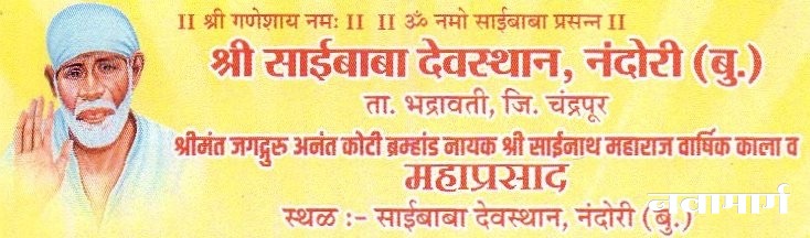 चंद्रपुर : भद्रावती तालुक्यातील नंदोरी बु येथे जगद्गुरु अनंत कोटी ब्रम्हांड नायक श्री साईनाथ महाराज यांचा वार्षिक कला व महाप्रसाद दि. 27 व 28 नोव्हेंबर 25 रोजी विविध कार्यक्रमाचे आयोजन करण्यात आले आहे.