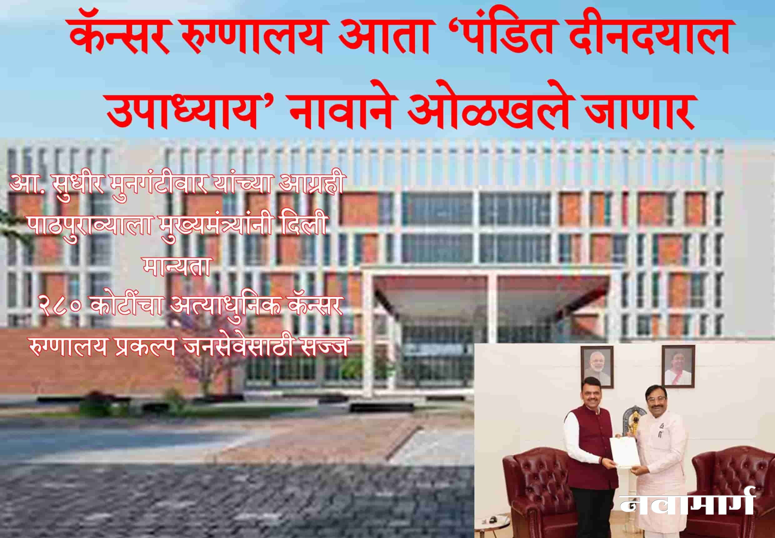 कॅन्सर हॉस्पिटलसाठी सातत्याने पाठपुरावा जिल्हा खनिज विकास प्रतिष्ठान, राज्य शासन आणि टाटा ट्रस्ट यांच्या विशेष सहकार्याने २८० कोटी रुपयांत उभारलेले हे भव्य कॅन्सर रुग्णालय आज पूर्णत्वास आले आहे. आ. सुधीर मुनगंटीवार यांनी २०१४ पासून कॅन्सर रुग्णालय स्थापनेसाठी सातत्याने पाठपुरावा केला. १७ एप्रिल २०१८ रोजीच्या मंत्रिमंडळ बैठकीत चंद्रपूर येथे अत्याधुनिक कॅन्सर रुग्णालय उभारण्याचा ऐतिहासिक निर्णय झाला आणि २६ जून २०१८ रोजी शासन निर्णय प्रकाशित झाला. आता आ. सुधीर मुनगंटीवार यांच्याच पुढाकारामुळे या रुग्णालयाला पंडित दीनदयाल उपाध्याय यांचे नाव देण्यात येणार आहे, हे विशेष.