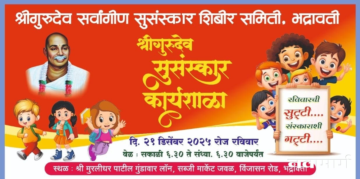 भद्रावती : विद्यार्थ्यांच्या सर्वांगीण व्यक्तिमत्व विकासासाठी एकदिवसीय श्रीगुरुदेव सुसंस्कार कार्यशाळेचे आयोजन करण्यात आले आहे. श्रीगुरुदेव सर्वांगीण सुसंस्कार शिबिर समिती, भद्रावती यांच्या वतीने ही कार्यशाळा रविवार, दिनांक २१ डिसेंबर २०२५ रोजी मुरलीधर पाटील गुंडावार लॉन, भद्रावती येथे होणार आहे. या कार्यशाळेत इयत्ता ६ वी ते १२ वी पर्यंतचे विद्यार्थी सहभागी होऊ शकणार आहेत.