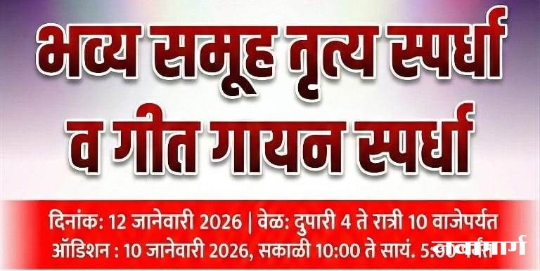 चंद्रपुर : स्वामी विवेकानंद यांच्या जयंतीनिमित्त, विवेकानंद महाविद्यालय भद्रावती येथील माजी विद्यार्थी संघ, राष्ट्रीय सेवा योजना (NSS) आणि नफिस कॉम्प्युटर एज्युकेशन यांच्या संयुक्त विद्यमाने सोमवार, १२ जानेवारी २०२६ रोजी भव्य समूह नृत्य आणि गीत गायन स्पर्धेचे आयोजन करण्यात आले आहे. स्थानिक कलाकारांच्या सुप्त गुणांना वाव देण्यासाठी आयोजित हा सोहळा दुपारी ४ ते रात्री १० वाजेपर्यंत महाविद्यालयाच्या प्रांगणात पार पडणार आहे. या स्पर्धेतील विजेत्यांना रोख रक्कम आणि सन्मानचिन्ह देऊन गौरविण्यात येणार आहे.