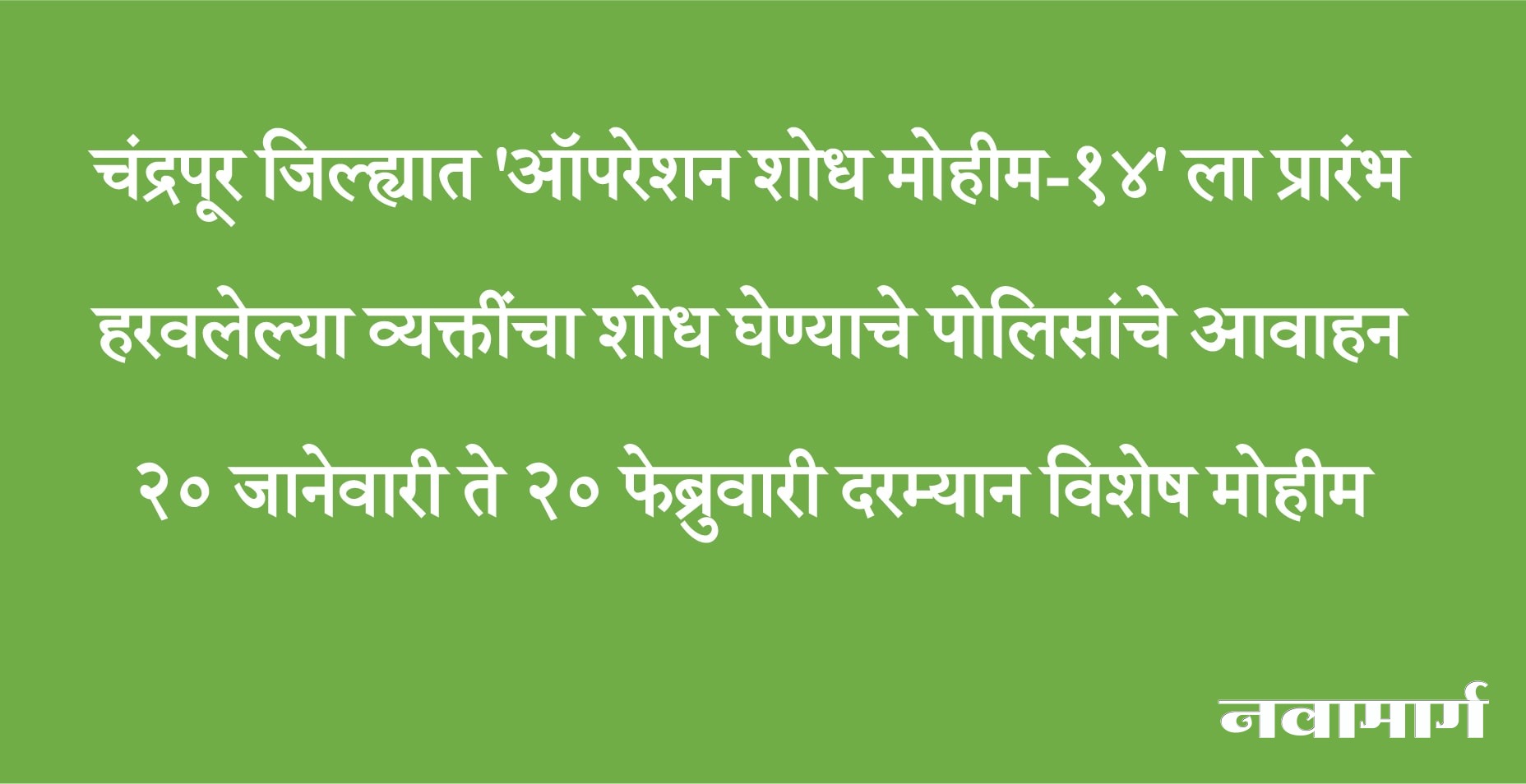चंद्रपूर : महाराष्ट्र राज्य पोलीस महासंचालकांच्या सूचनेनुसार, चंद्रपूर जिल्हा पोलीस दलाच्या वतीने ‘ऑपरेशन शोध मोहीम-१४’ राबवण्यात येत आहे. २० जानेवारी ते २० फेब्रुवारी २०२६ या कालावधीत ही विशेष मोहीम चालणार असून, याद्वारे बेपत्ता किंवा घरून निघून गेलेल्या मुले, मुली, युवक-युवती आणि वयोवृद्ध व्यक्तींचा शोध घेतला जाणार आहे.