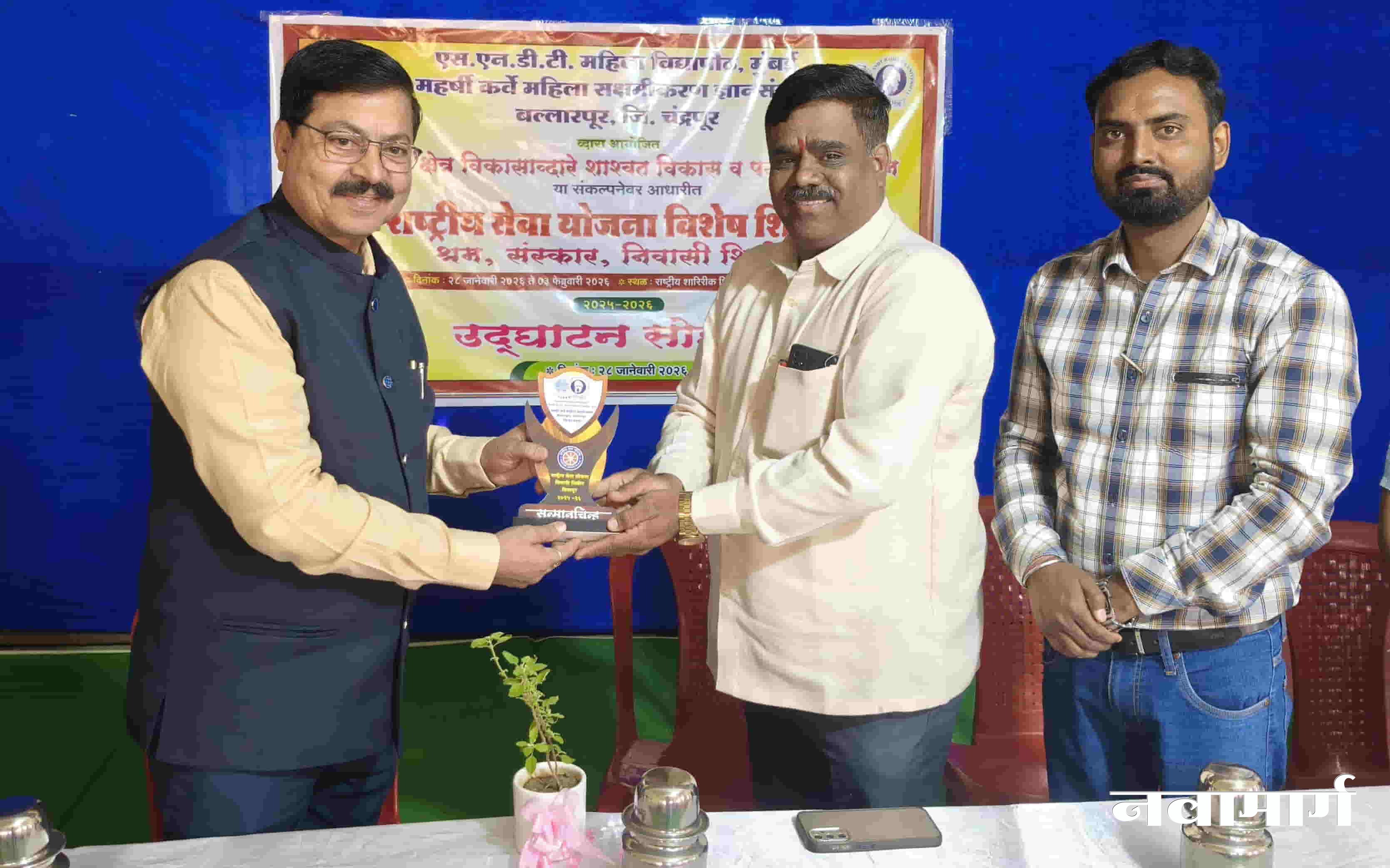 बल्लारपूर : राष्ट्रीय सेवा योजना शिबिर हे समाजाशी प्रत्यक्ष जुळून घेण्याचे प्रभावी साधन आहे, असे प्रतिपादन मा. ॲड. निलेश चोरे यांनी केले. एस.एन.डी.टी. महिला विद्यापीठ,बल्लारपूर आवार (महर्षी कर्वे महिला सक्षमीकरण ज्ञानसंकुल ) यांच्या तर्फे आयोजित राष्ट्रीय सेवा योजनेच्या सात दिवसीय निवासी शिबिराच्या उद्घाटनप्रसंगी ते बोलत होते. हे शिबिर शारीरिक शिक्षण महाविद्यालय, विसापूर येथे आयोजित करण्यात आले आहे.