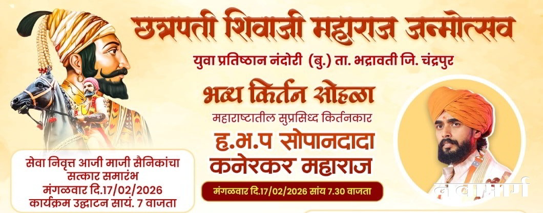 चंद्रपूर : भद्रावती तालुक्यातील नंदोरी (बु.) येथे युवा प्रतिष्ठानच्या वतीने १७ ते १९ फेब्रुवारी २०२६ या काळात छत्रपती शिवाजी महाराज जन्मोत्सवाचे मोठ्या थाटात आयोजन करण्यात आले आहे. या महोत्सवाचे मुख्य आकर्षण म्हणजे महाराष्ट्रातील सुप्रसिद्ध कीर्तनकार ह.भ.प. सोपानदादा कनेरकर महाराज यांचा होणारा ‘भव्य कीर्तन सोहळा’ असून, याकडे संपूर्ण परिसराचे लक्ष लागले आहे.