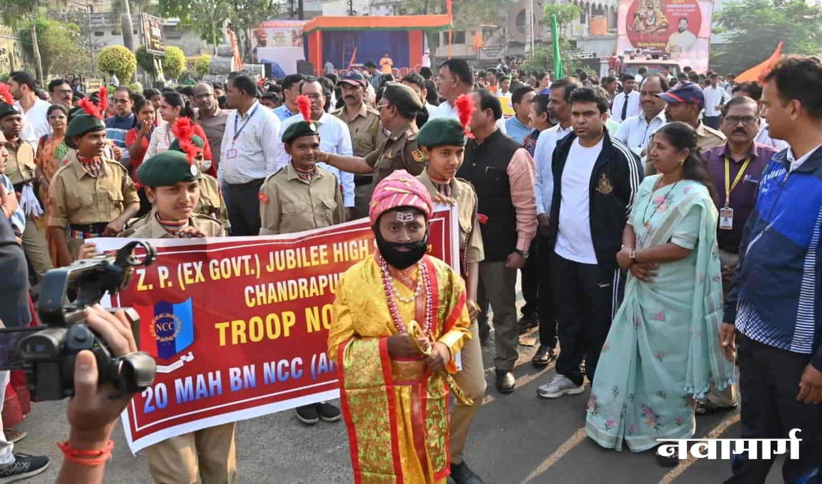 चंद्रपूर : छत्रपती शिवाजी महाराज जयंतीनिमित्त चंद्रपूर शहरात गुरुवारी (दि. १९) जिल्हा प्रशासन, महानगरपालिका आणि क्रीडा विभागाच्या संयुक्त विद्यमाने भव्य पदयात्रेचे आयोजन करण्यात आले होते. क्रीडा व युवक सेवा संचालनालय, पुणे यांच्या निर्देशानुसार आयोजित या पदयात्रेला शिवप्रेमी आणि विद्यार्थ्यांचा उत्स्फूर्त प्रतिसाद लाभला.