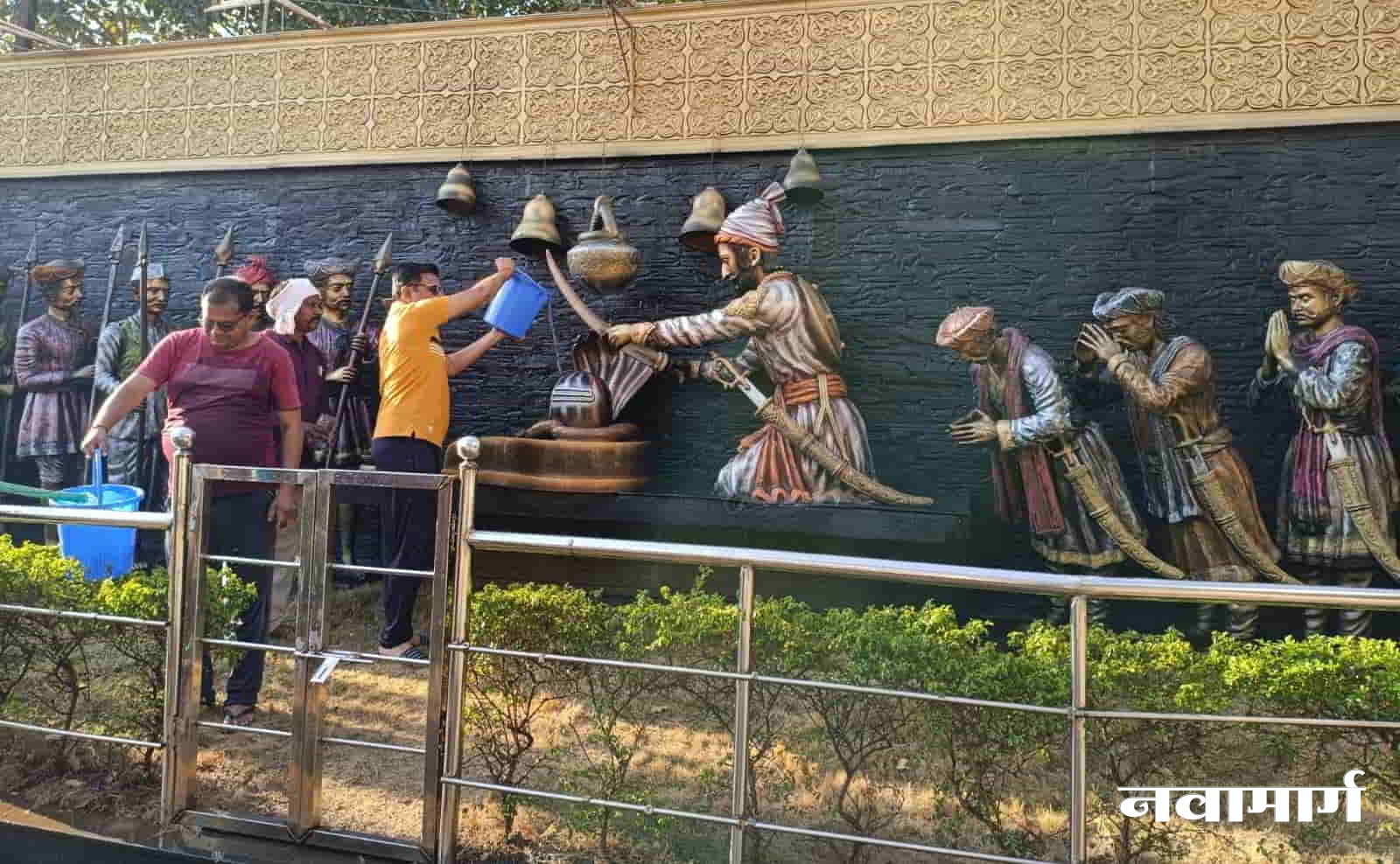 भद्रावती : स्थानिक भद्रनाग मंदिर चौकातील बुद्ध लेणी प्रवेशद्वाराच्या दोन्ही बाजूंना नगरपरिषदेतर्फे उभारण्यात आलेल्या ‘स्वराज्याची शपथ’ सोहळा आणि बुद्धकालीन देखाव्यांची आज शिवजयंतीच्या पर्वावर स्वच्छता करण्यात आली. शिवसेनेचे ज्येष्ठ नेते तथा माजी नगराध्यक्ष ज्ञानेश्वर डुकरे यांच्या नेतृत्वात शिवसैनिकांनी हा संपूर्ण परिसर पाण्याने स्वच्छ करून एक आदर्श पायंडा घालून दिला.