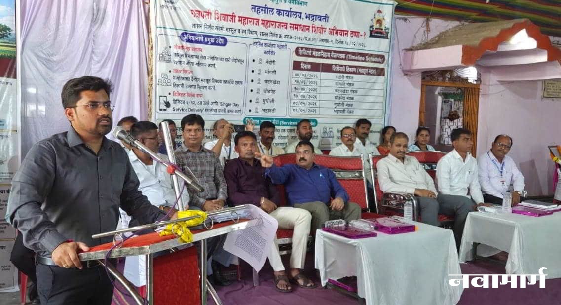 ​भद्रावती : शासन आणि सर्वसामान्य जनता यांच्यातील अंतर कमी करून पारदर्शक कारभार करण्याच्या उद्देशाने महाराष्ट्र शासनाने ‘छत्रपती शिवाजी महाराज महाराजस्व समाधान शिबिर’ सुरू केले आहे. या अभियानांतर्गत आता शासकीय विभाग स्वतः शेतकऱ्यांच्या आणि सामान्य जनतेच्या दारी जाऊन त्यांचे प्रश्न सोडविणार आहे, असे प्रतिपादन उपविभागीय अधिकारी संदीप भस्के यांनी केले. ​भद्रावती तालुक्यातील नंदोरी येथे योजित ‘छत्रपती शिवाजी महाराज महाराजस्व समाधान शिबिरा’च्या उद्घाटन प्रसंगी ते बोलत होते.