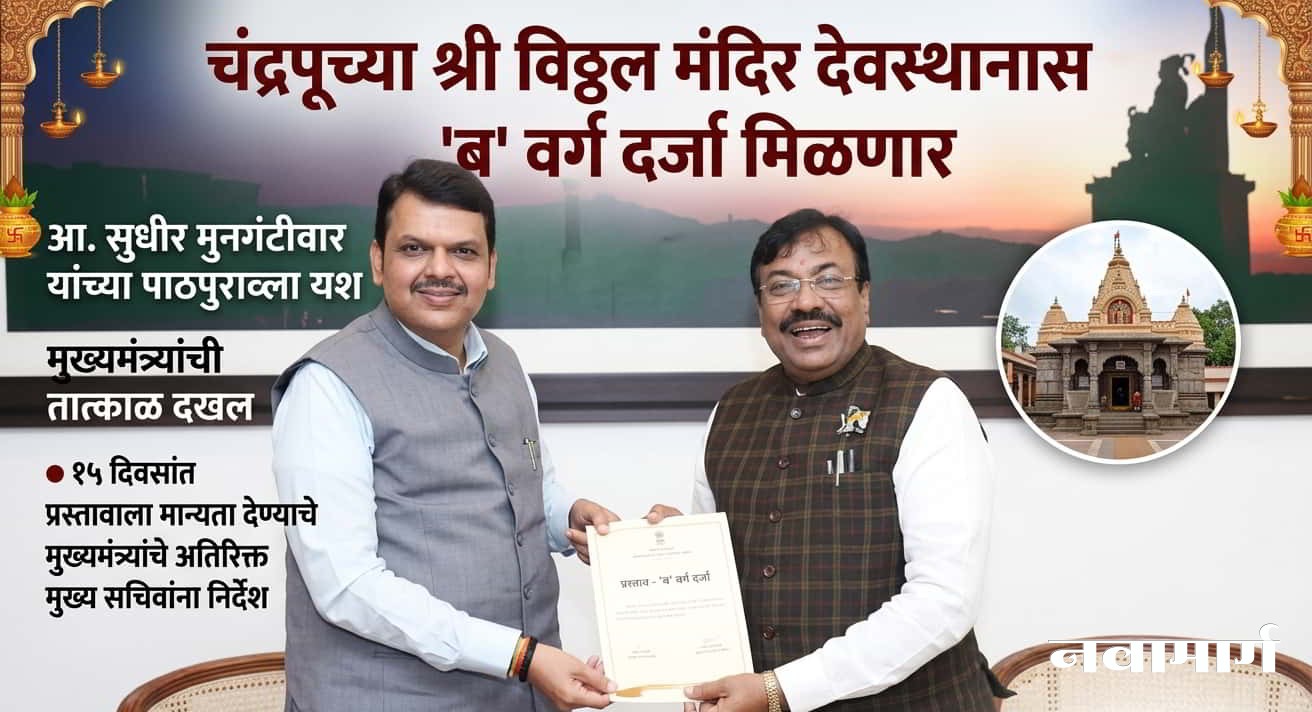 चंद्रपूर : चंद्रपूर शहरातील ऐतिहासिक व प्राचीन श्री विठ्ठल मंदिर देवस्थानास शासनाचा ‘ब’ वर्ग तीर्थक्षेत्राचा दर्जा प्रदान करण्याच्या प्रक्रियेला आता मोठी गती मिळाली आहे. राज्याचे माजी वने व सांस्कृतिक कार्य मंत्री आ. सुधीर मुनगंटीवार यांनी यासंदर्भात केलेल्या मागणीची मुख्यमंत्री देवेंद्र फडणवीस यांनी तात्काळ दखल घेतली आहे. पुढील १५ दिवसांत या प्रस्तावाला मान्यता देण्याचे निर्देश मुख्यमंत्र्यांनी नगर विकास विभागाच्या अतिरिक्त मुख्य सचिवांना दिले आहेत.