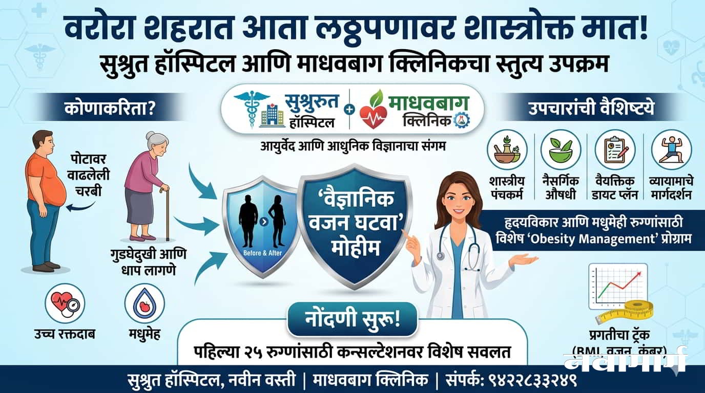 वरोरा : धावपळीची जीवनशैली आणि चुकीच्या आहारपद्धतीमुळे आजकाल लठ्ठपणा ही एक गंभीर समस्या बनली आहे. पोटावर वाढलेली चरबी, श्वास लागणे, गुडघेदुखी यांसारख्या त्रासांसोबतच लठ्ठपणामुळे मधुमेह (Diabetes) आणि उच्च रक्तदाब (BP) यांसारख्या आजारांचा धोका वाढतो. या पार्श्वभूमीवर, वरोरा येथील सुश्रुत हॉस्पिटल आणि माधवबाग क्लिनिक यांच्या संयुक्त विद्यमाने लठ्ठपणावर पूर्ण नियंत्रण मिळवण्यासाठी ‘वैज्ञानिक वजन घटवा’ मोहिमेचा शुभारंभ करण्यात आला आहे.