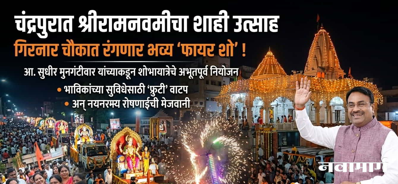 चंद्रपूर : प्रभू श्रीरामांच्या जन्मोत्सवानिमित्त चंद्रपूर शहरात भक्तीचा महाकुंभ उसळणार आहे. श्रीरामनवमीच्या पावन आणि मंगलमय उत्सवानिमित्त दिनांक २६ मार्च रोजी शहरातून निघणाऱ्या भव्य शोभायात्रेच्या स्वागतासाठी आमदार सुधीर मुनगंटीवार व मुनगंटीवार परिवारातर्फे स्थानिक गिरनार चौक येथे एका विशेष आणि भव्य स्वागत सोहळ्याचे आयोजन करण्यात आले आहे. या सोहळ्याचे मुख्य आकर्षण म्हणजे आकाशात झळाळणारा ‘अतिशय आकर्षक फायर शो’, जो या उत्सवाच्या दिमाखात अधिक भर घालणार आहे.