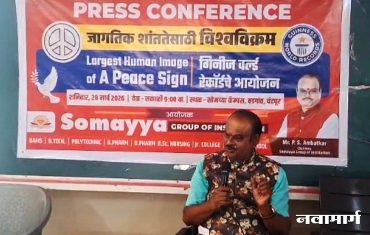 चंद्रपूर : जगभरात सध्या युद्धजन्य परिस्थिती, वाढती महागाई आणि राजकीय अस्थिरतेचे सावट असताना, “युद्ध नको, तर शांती हवी” असा वैश्विक संदेश देण्यासाठी चंद्रपूर सज्ज झाले आहे. येथील सोमय्या ग्रुप ऑफ इन्स्टिट्युशन्सच्या वतीने येत्या शनिवार, २८ मार्च २०२६ रोजी एक अभूतपूर्व सोहळा आयोजित करण्यात आला आहे. वडगाव येथील सोमय्या कॅम्पसमध्ये हजारो विद्यार्थ्यांच्या सहभागातून जगातील सर्वात मोठे मानवी ‘जागतिक शांतता चिन्ह’ (International Peace Symbol) साकारले जाणार आहे.
