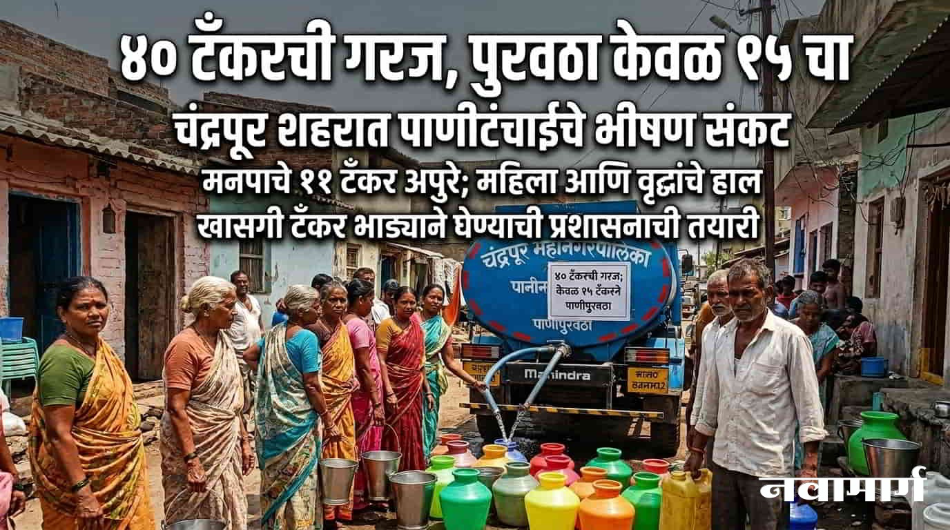 चंद्रपूर : उन्हाळा सुरू झाला असून चंद्रपूर शहरातील पाणीटंचाई अधिकच गंभीर होत आहे. शहराच्या अनेक भागांमध्ये पाण्यासाठी हाहाकार उडाला असून, रहिवाशांना मोठा त्रास सहन करावा लागत आहे. सध्या परिस्थिती इतकी बिकट झाली आहे की, येत्या काही दिवसांत पाण्याची मागणी आणखी वाढणार असून या उन्हाळ्यात चंद्रपूरमधील पाणीटंचाई अधिक रौद्र रूप धारण करण्याची शक्यता आहे. सध्या शहराला १५ टँकरद्वारे पाणीपुरवठा होत आहे, मात्र प्रत्यक्षात ४० टँकरची नितांत गरज आहे.