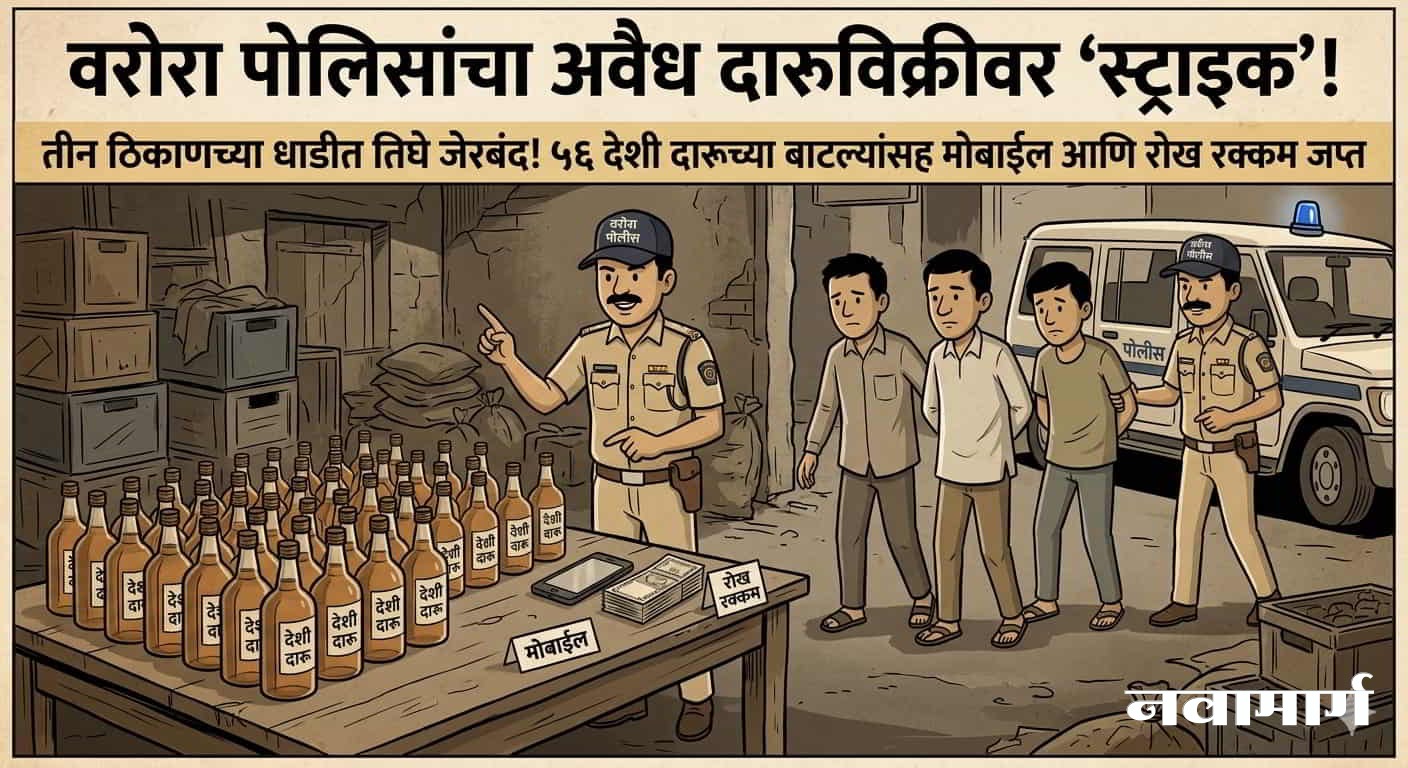 वरोरा : वरोरा शहरात व परिसरात सुरू असलेल्या अवैध दारूविक्री विरोधात पोलिसांनी आपली मोहीम तीव्र केली असून, एकाच दिवशी तीन वेगवेगळ्या ठिकाणी छापे टाकून मोठ्या कारवाईचा धडाका लावला आहे. गुप्त बातमीदारांकडून मिळालेल्या माहितीच्या आधारे दि. ०९ एप्रिल २०२६ रोजी ही कारवाई करण्यात आली. यामध्ये एकूण ५६ देशी दारूच्या बाटल्या, मोबाईल आणि रोख रक्कम असा मुद्देमाल जप्त करण्यात आला असून तिघांना अटक करण्यात आली आहे.