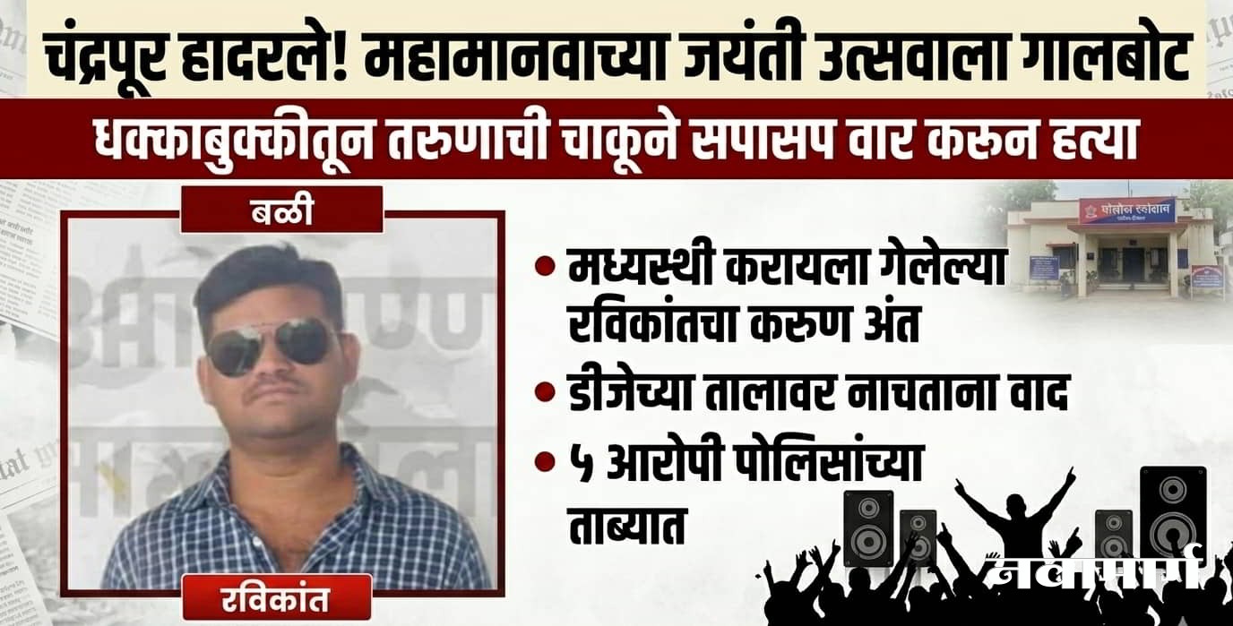 चंद्रपूर : जिल्ह्यासह संपूर्ण चंद्रपूर शहर महामानव डॉ. बाबासाहेब आंबेडकर यांच्या जयंतीचा उत्साह शहरात शिगेला पोहोचलेला असतानाच, मंगळवारी मध्यरात्री चंद्रपूरच्या मुख्य गांधी चौकात एक काळजाचा थरकाप उडवणारी घटना घडली. डीजेच्या तालावर नाचताना झालेल्या किरकोळ धक्काबुक्कीचे पर्यवसान टोकाच्या वादात झाले आणि या वादात एका ३६ वर्षीय तरुणाची चाकूने सपासप वार करून निर्घृण हत्या करण्यात आली. रविकांत टेम्बुरकर असे मृताचे नाव असून, या घटनेमुळे संपूर्ण जिल्ह्यात एकच खळबळ उडाली आहे.