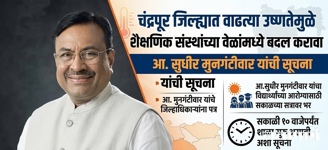 . याच पार्श्वभूमीवर सकाळी १० नंतर उष्णतेची तीव्रता अधिक वाढत असल्याने जिल्ह्यातील सर्व प्रकारच्या (शासकीय, अनुदानित व खासगी) शाळा व महाविद्यालयांच्या वेळांमध्ये तात्पुरता बदल करून सकाळी सुरू करून जास्तीत जास्त सकाळी १० वाजेपर्यंत शाळा सुरू असावी, अशा सूचना आ. मुनगंटीवार यांनी केल्या आहे.विद्यार्थ्यांच्या आरोग्य आणि सुरक्षिततेच्या दृष्टीने हा निर्णय अत्यंत आवश्यक असून प्रशासनाने याबाबत तात्काळ सकारात्मक निर्णय घ्यावा, असेही त्यांनी जिल्हाधिकाऱ्यांना दिलेल्या पत्रात म्हटले आहे.