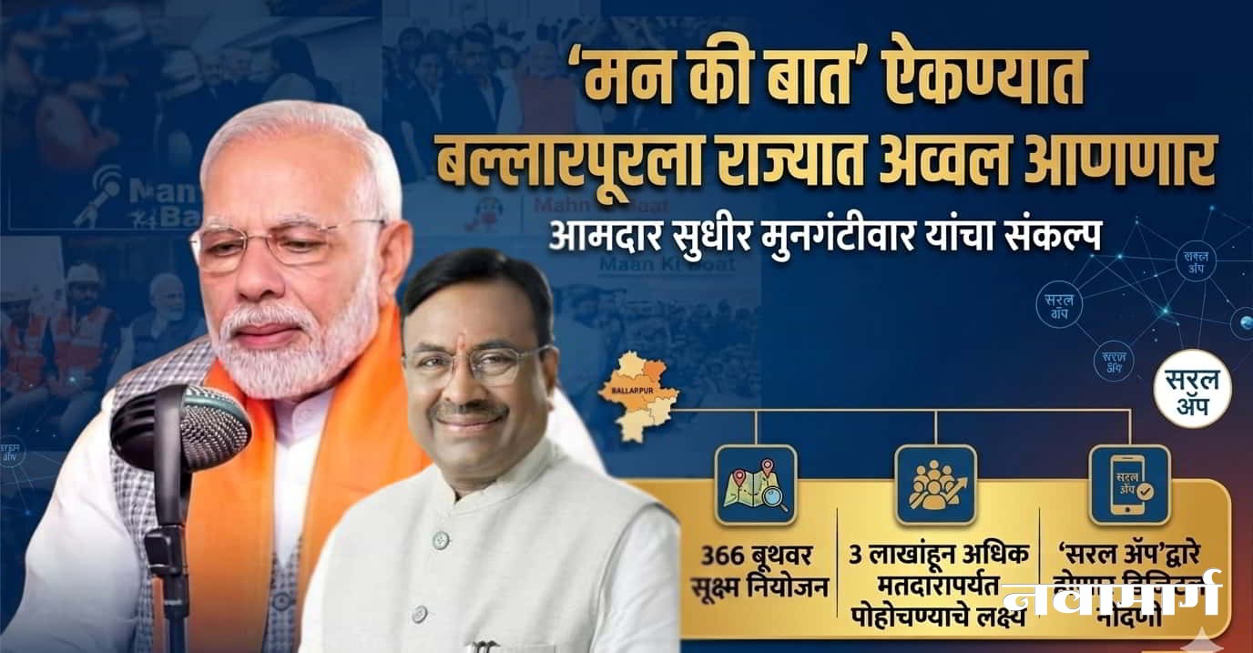 चंद्रपूर : देशगौरव पंतप्रधान नरेंद्र मोदी यांच्या ‘मन की बात’ या संवादमालिकेच्या १३० व्या भागाच्या निमित्ताने बल्लारपूर विधानसभा क्षेत्राला संपूर्ण महाराष्ट्र राज्यात प्रथम क्रमांकावर आणण्याचे ध्येय आमदार सुधीर मुनगंटीवार यांनी निश्चित केले आहे. २६ एप्रिल २०२६ रोजी सकाळी ११ वाजता होणाऱ्या या ऐतिहासिक कार्यक्रमासाठी कार्यकर्त्यांनी ‘मिशन मोड’मध्ये काम करून प्रत्येक बूथवर जास्तीत जास्त नागरिकांचा सहभाग सुनिश्चित करावा, असे आवाहन राज्याचे माजी वने, सांस्कृतिक कार्य व मत्स्यव्यवसाय मंत्री आमदार सुधीर मुनगंटीवार यांनी पदाधिकारी आणि कार्यकर्त्यांच्या बैठकीत केले.