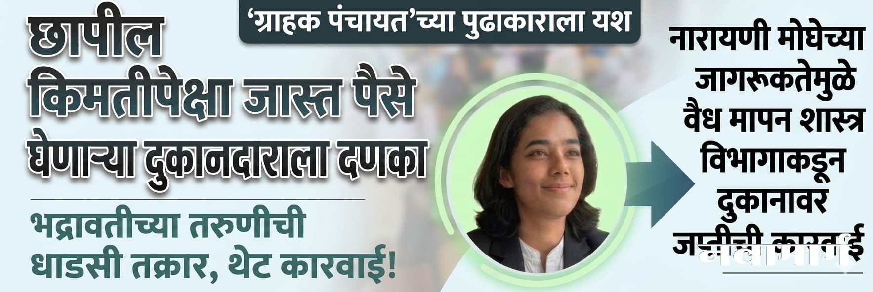 भद्रावती : शहरातील गुरुनगर येथील रहिवासी आणि शासकीय अभियांत्रिकी महाविद्यालय, चंद्रपूरची विद्यार्थिनी नारायणी मोघे हिने दाखवलेल्या ग्राहक जागरूकतेमुळे एका मनमानी करणाऱ्या दुकानदारावर प्रशासकीय कारवाई करण्यात आली आहे. छापील किमतीपेक्षा (MRP) जास्त पैसे उकळणाऱ्या दुकानदाराविरुद्ध नारायणीने दिलेला लढा इतर ग्राहकांसाठी प्रेरणादायी ठरला आहे.